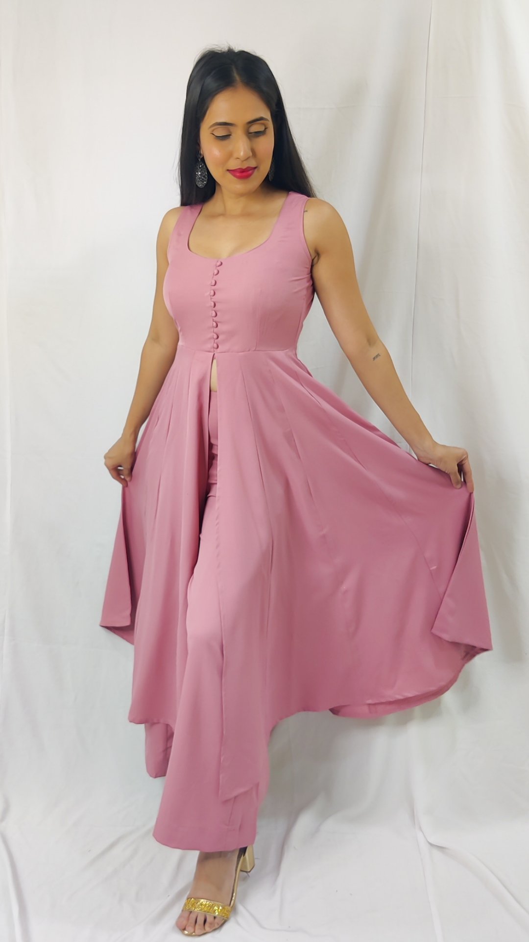 This is set of two pieces, top is made with center slit and bottom made as multi pannel Palazzo
