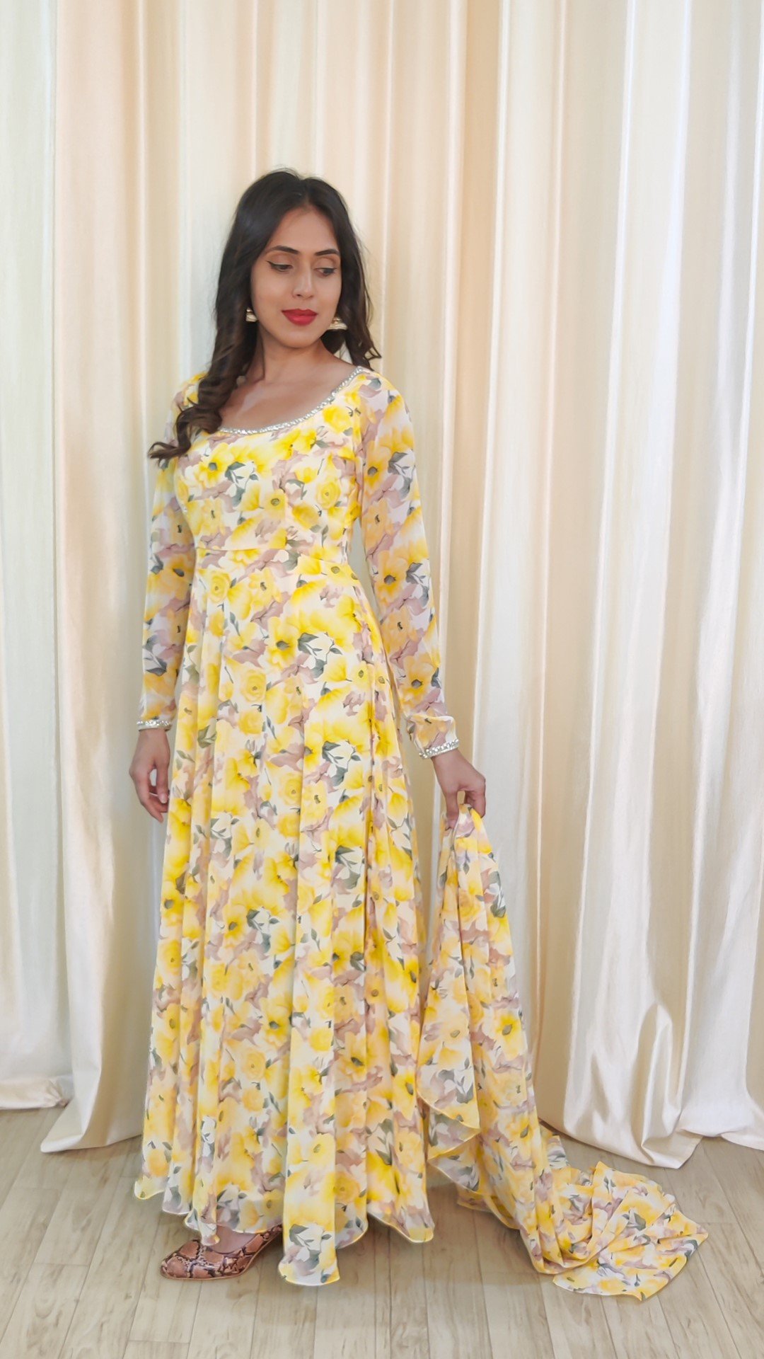 1. Vibrant Floral Print: The dress boasts a delightful yellow background adorned with a charming and intricate floral print. Each bloom is a masterpiece of color and detail, creating a visually captivating ensemble.